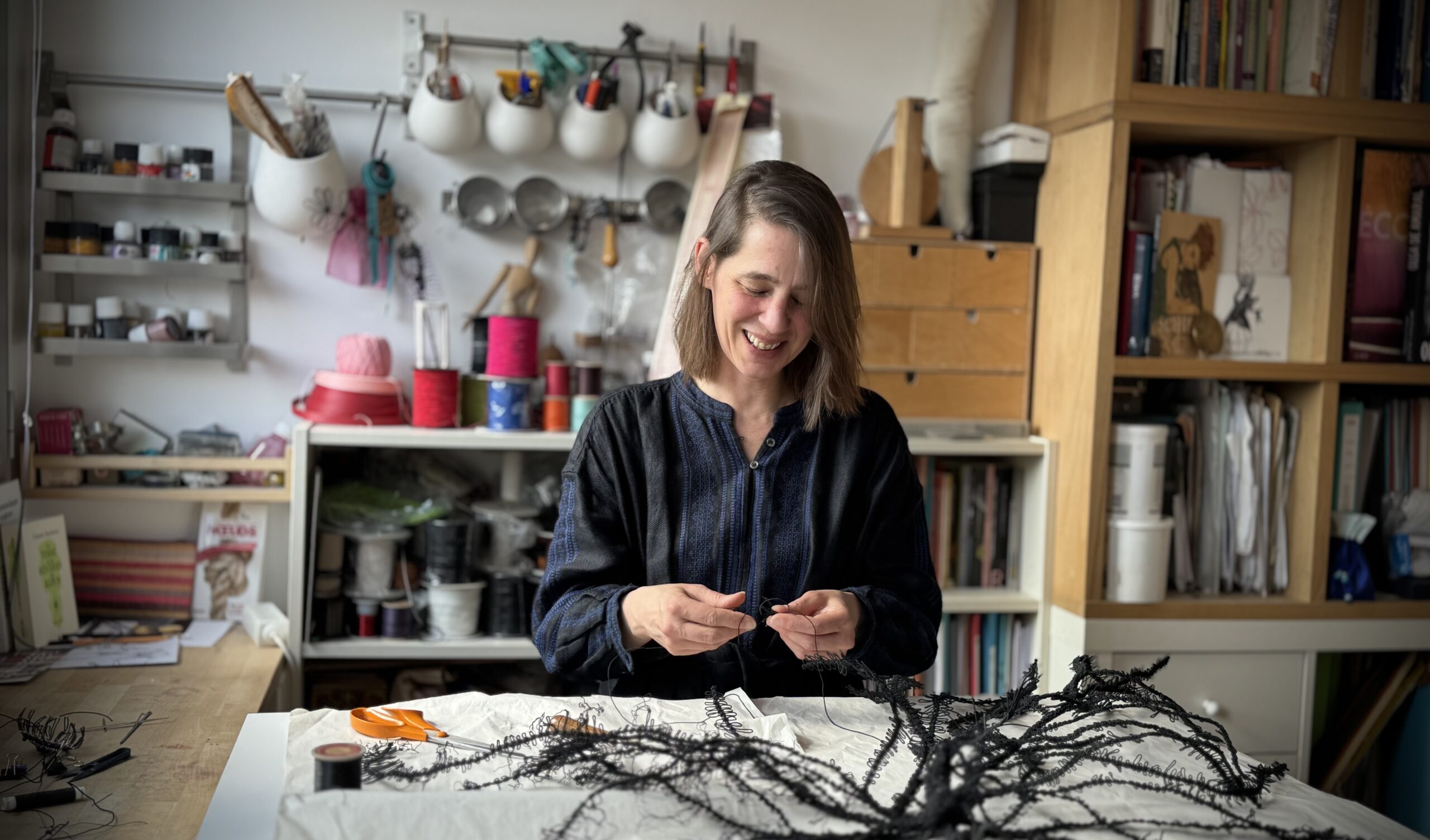 Aude Tahon crée une matière textile à partir d’une technique traditionnelle coréenne dite « Art des nœuds Maedup » qu’elle applique à la création de parures et sculptures textiles.